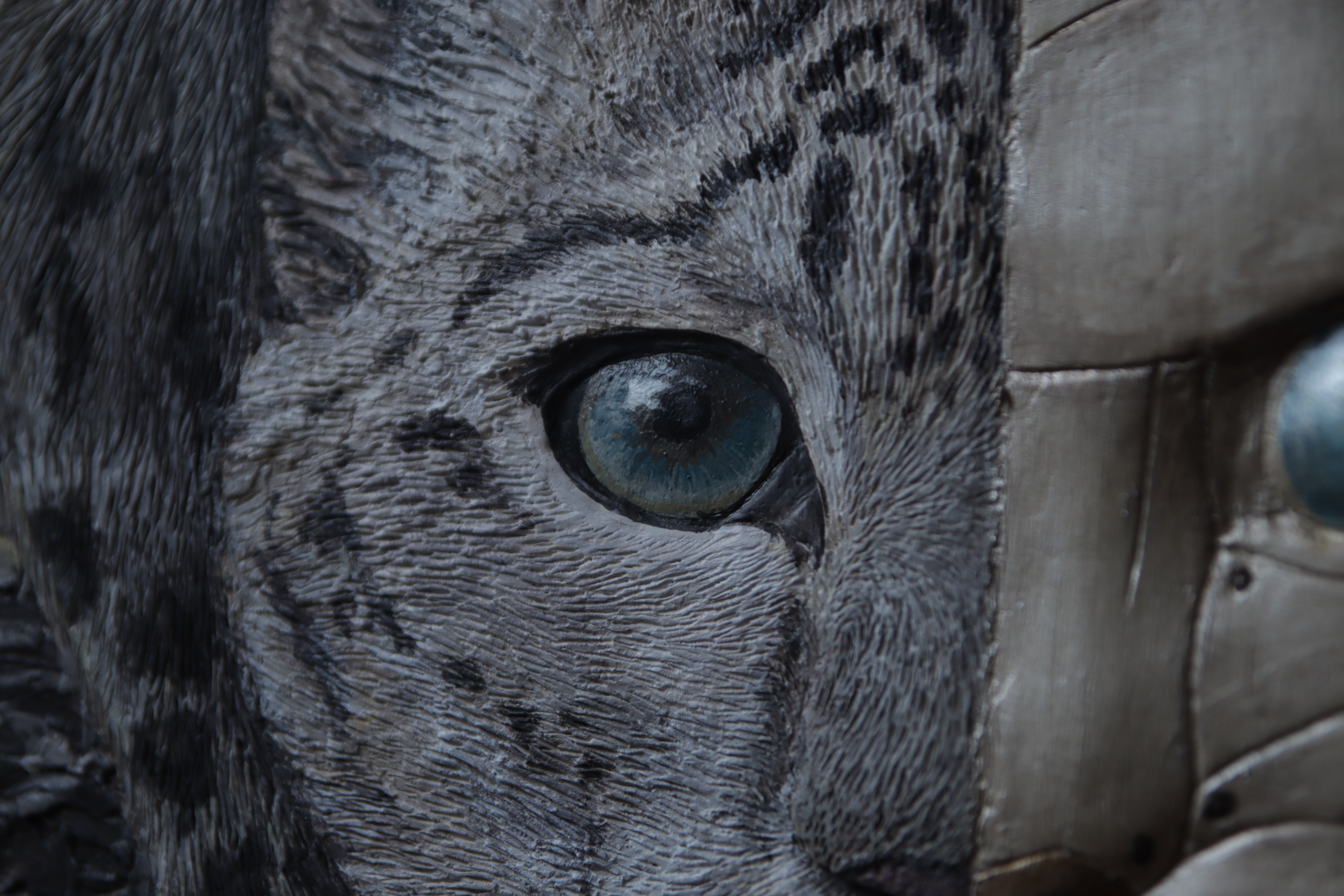 Слева — живой снежный барс, символ природной мощи, инстинкта и дикой свободы. Справа — его футуристическая проекция, механическое существо, собранное из металлических пластин, словно из мира киберпанка.