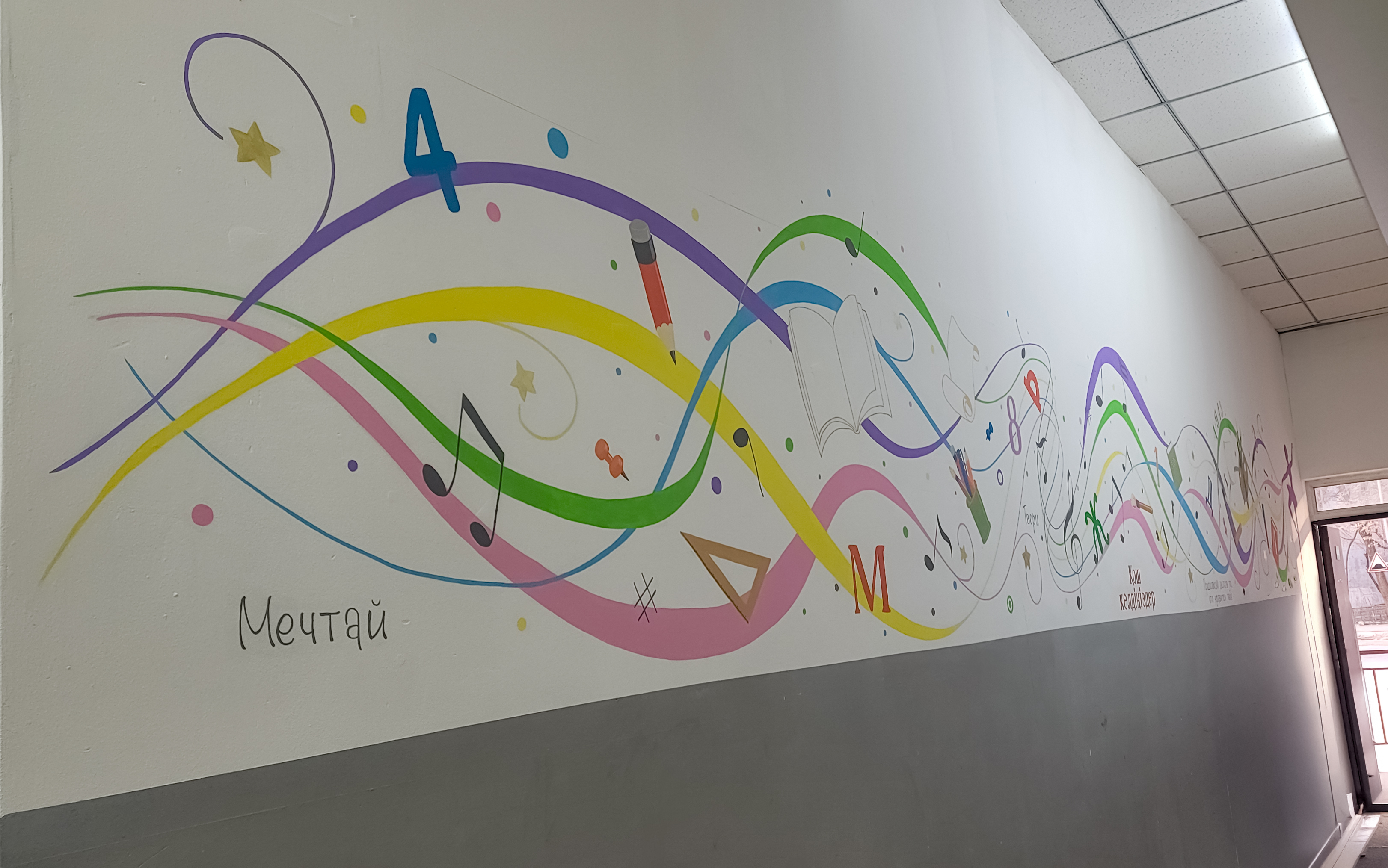 Эта яркая настенная роспись создана студией ArtViko специально для студии творчества и образования в Алматы. Композиция сочетает плавные цветные линии, музыкальные ноты, книги, карандаши и геометрические элементы, символизируя путь развития, знаний и креативности.